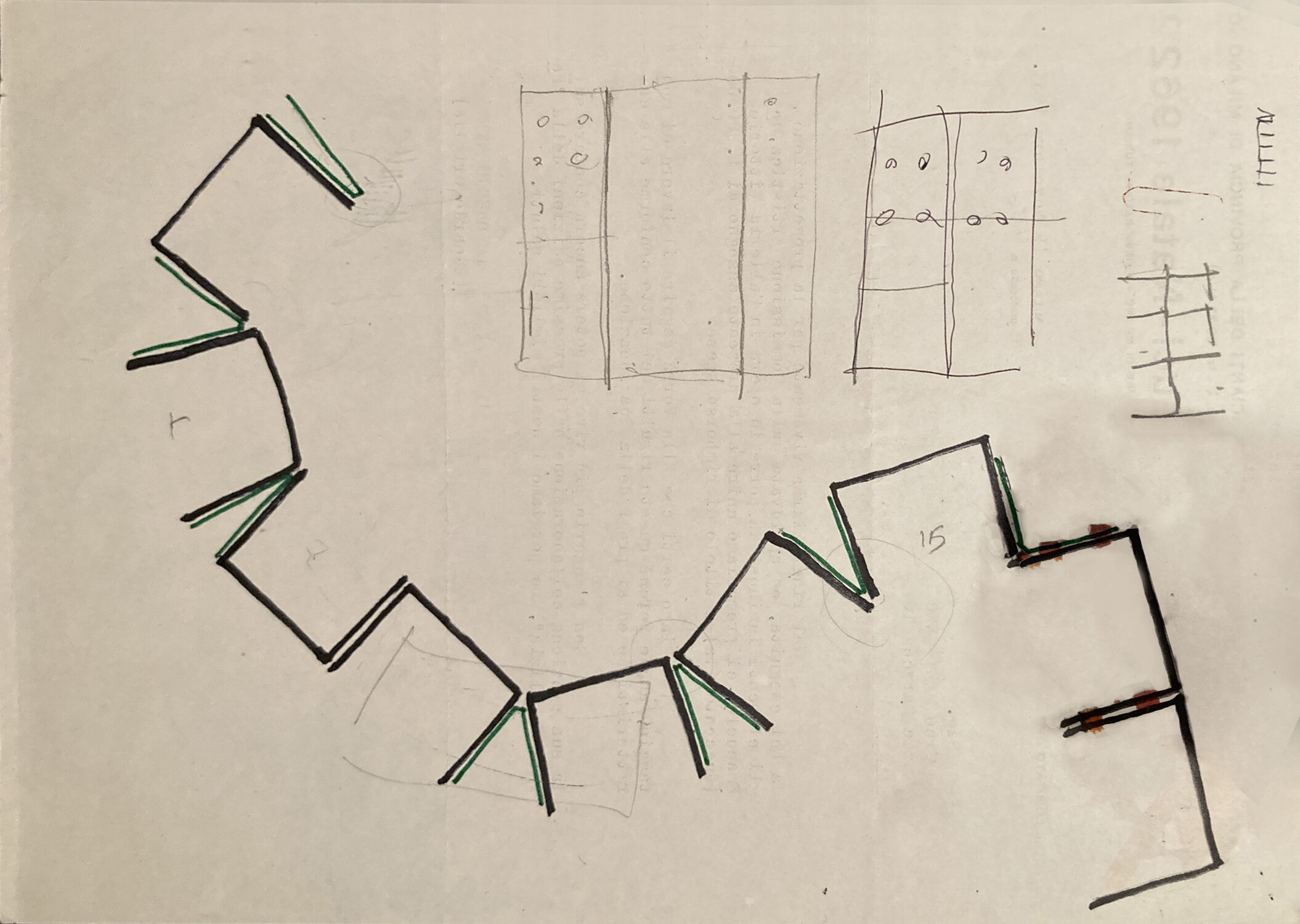 Tra i documenti conservati allo CSAC, gli schizzi propongono alcune ipotesi di pianta e lo studio del dettaglio dell’incastro tra i montanti in cartone e i ripiani in PVC, mentre i disegni tecnici presentano l’attacco definitivo scelto e la planimetria per un allestimento al negozio Danese (mostra “Mobilier”, 1969).
